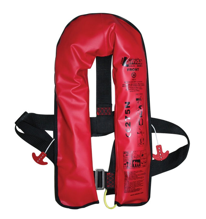 Chaleco salvavidas inflable Solas Lamda 180N para máxima seguridad a bordo. Cuentan con cámaras gemelas para doble seguridad y cada cámara se puede inflar a través de su cabezal de operación automática individual que también admite activación manual.