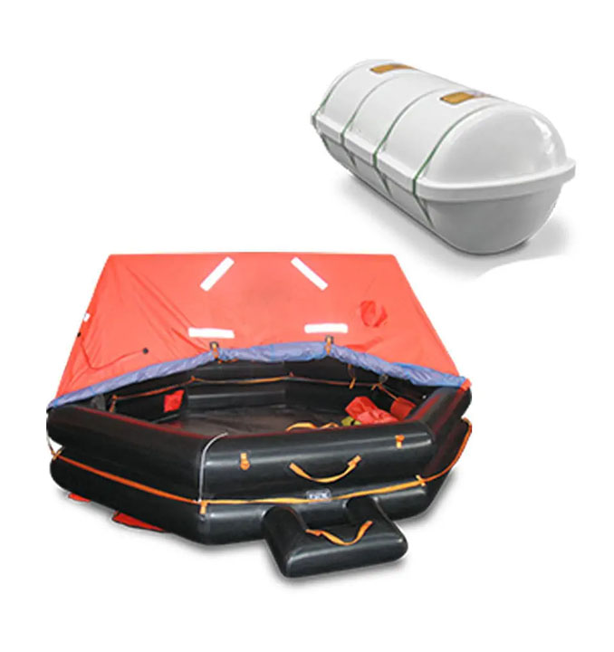 La balsa salvavidas está embalada en un contenedor de PRFV (Poliéster Reforzado con Vidrio) con refuerzos interiores que la hacen adaptable a cualquier tipo de cuna. Esta balsa salvavidas está aprobada de acuerdo con el último capítulo III de SOLAS 74 y enmiendas y de acuerdo con EC MED.
