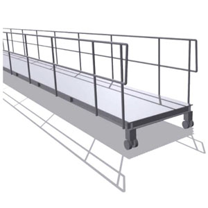 Fabricada en vigas IPR de 4x4, travesaños en ángulo de 3 x 1/4, lamina antiderrapante calibre 14 en aluminio y 2 ruedas de apoyo.