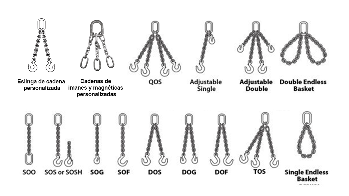 ESLINGAS de cadena de elevación que incluyen: eslingas de cadena ajustables de una o dos ramas, eslingas de cadena de 2, 3 o 4 ramas y eslingas de cadena personalizadas. Las eslingas de cadena se utilizan en la industria aeroespacial, automotriz, construcción de puentes, construcción de carreteras y calles, ensamblaje de equipos pesados, fabricación en fábrica, fabricación de metales primarios, fabricación de acero, militar, minería, ferrocarriles y servicios públicos, incluidas las industrias de energía, agua, alcantarillado y tuberías .